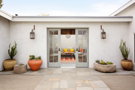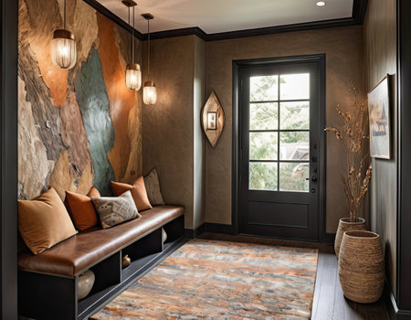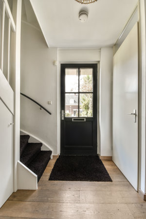 Cozy entrance part of the house with a glass door with a dark tiled floor