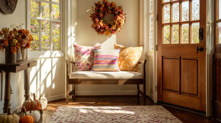 Decorated entrance of a house with welcome sign on a wooden barrow