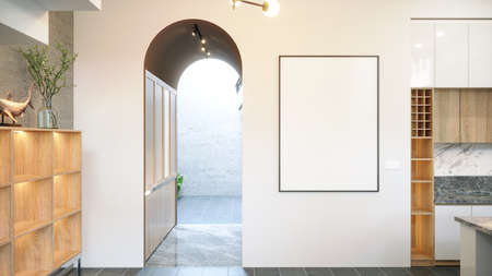 Blank photo frame in diningroom interior, on wooden wall, 3d rendering Premium Photo