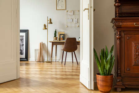 Plant next to door in white workspace interior with chair at desk next to gold lamp. Real photo