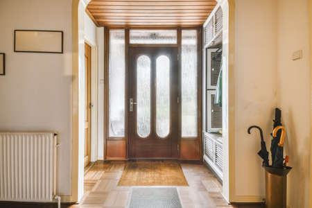 Repaired Hallway to the main entrance in old European apartment building entrance. View inside the entrance corridor of old apartment building