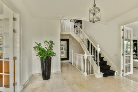 Amsterdam, Netherlands - 10 April, 2021: a living room with white walls and marble flooring in front of the staircase leading up to the second floor