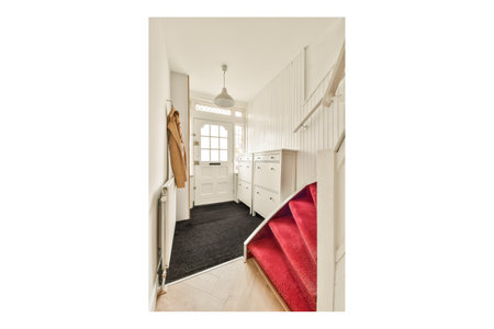 A stylish entryway featuring a vibrant red carpet contrasting against clean white walls, creating a welcoming atmosphere. The design is modern and minimalistic.