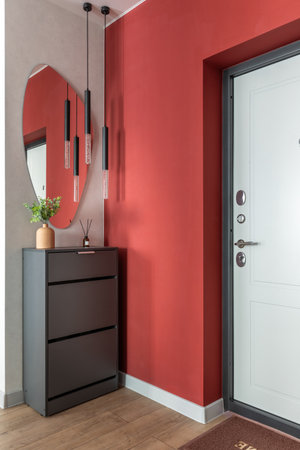 Stylish modern hallway with a red accent wall, black cabinet, decorative mirror, and pendant lights creating a warm elegant apartment entryway.