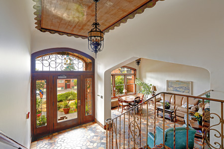 Foyer in old residential building in Downtown, Seattle. Mosaic tile floor, decorated ceiling and wooden entance door together with wrough iron railings merge a visitor into historic atmosphere