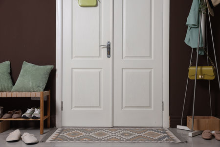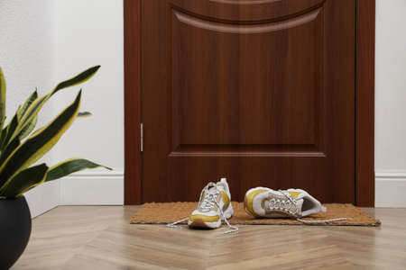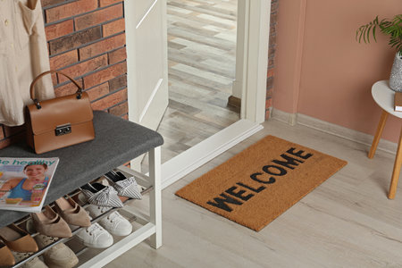 Doormat with word Welcome near shoe rack on white wooden floor in hall