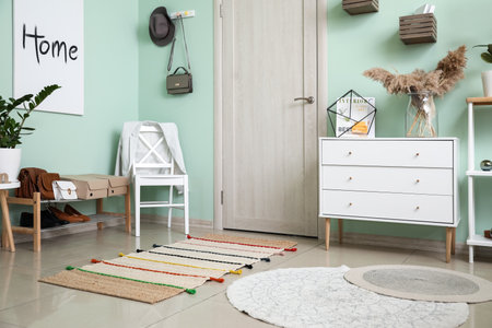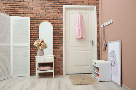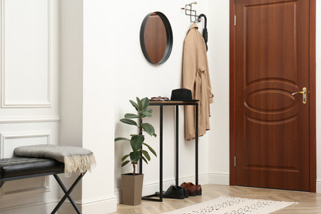 Hallway interior with beautiful houseplant, soft ottoman and door mat on floor near entrance