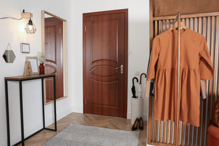 Frontal view of a closed wooden door. A fragment of the entrance of a modern apartment