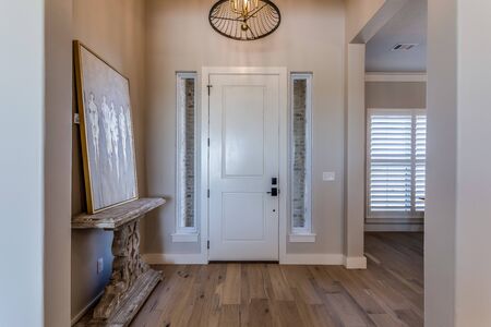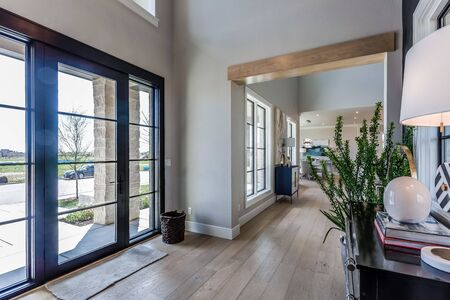 Chic foyer features a glass panel front door flanked by skylights, white console table positioned under vintage wall clock atop light wood hardwood floor.