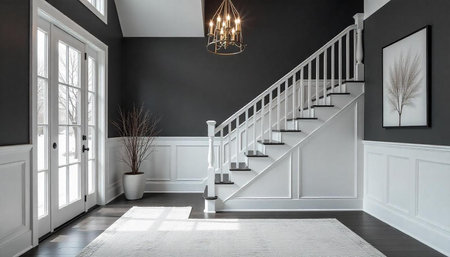 Elegant foyer showcasing staircase, doors, and natural light in winter