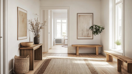 Farmhouse hallway and living room in white and blue tones with frame mockup. Wooden bench, coat rack and sofa. Glass entrance door, vintage interior design