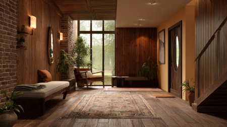 An industrial entryway with textured concrete walls and a wooden console table holding a vase with dried branches and a decorative bowl. Frosted glass doors are central, with a brown leather bench and a round clock on the wall. A textured rug lies on the concrete floor.