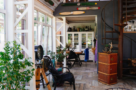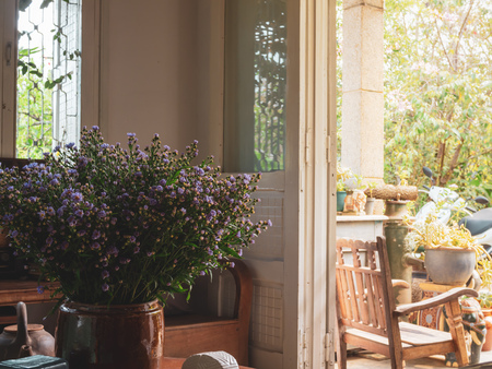 Living Room Decoration with Wildflower, Retro Traditional Wooden Chairs and Wooden Window and White Open Door and The Park Outside with Local White Motorbike in Vintage Style