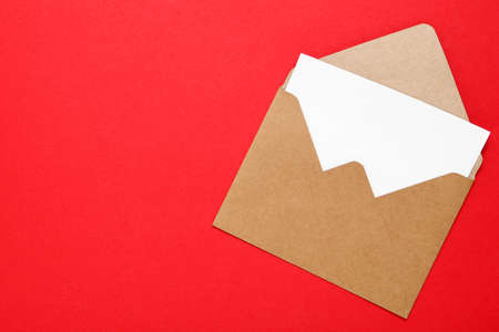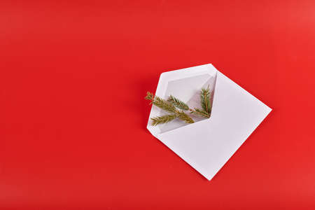 Envelope with blank space for text or greeting on red background, as symbol of getting mail, advertisement element. Corresponds in office, greeting card mockup. New year card.