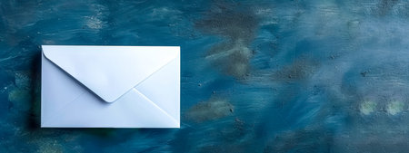 A rectangular, electric blue envelope rests on a sky-blue surface resembling clouds.