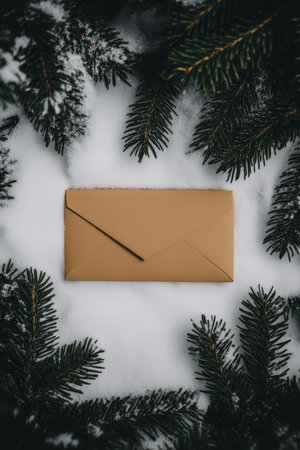 Brown envelope on snow-covered evergreen branches, winter theme.