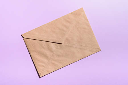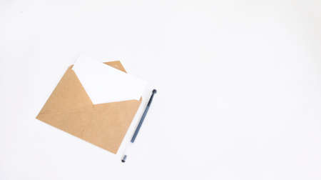 Banner containing craft paper envelope on white background. Copy space. High quality photo