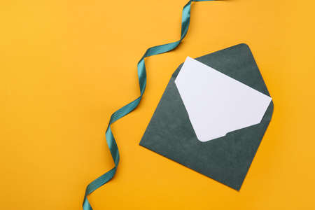 One yellow envelope with a blank white card. Yellow background. Mockup with envelope and blank card. Space for text.
