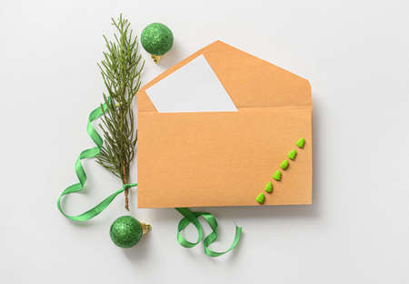 Christmas greeting card mockup with envelope and fir branches on gray background
