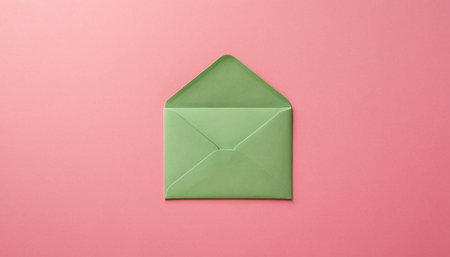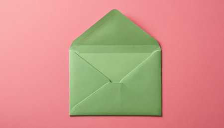 Elegant Green Envelope on a Pink Background, Stylish Stationery Item for Business and Personal Correspondence, Minimalist Design Concept with Vibrant Colors, Top View AI Generative