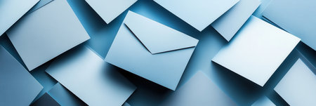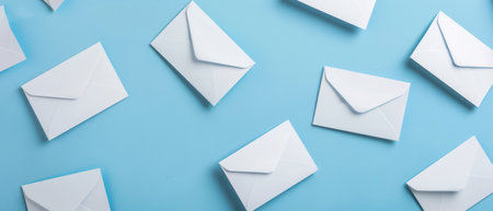 A flat lay composition of multiple white envelopes scattered on a light blue background. The envelopes are arranged in a seemingly random pattern, creating a visually appealing and minimalist aesthetic.