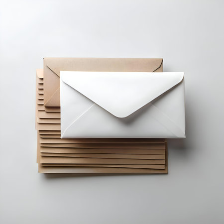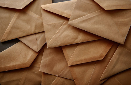 A stack of brown envelopes with a single white envelope on top. Perfect for showcasing your latest design. website. or message.