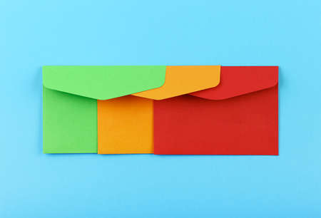 Close up group of three colorful mail envelopes, green, yellow and red, over pastel blue paper background, elevated top view, directly above