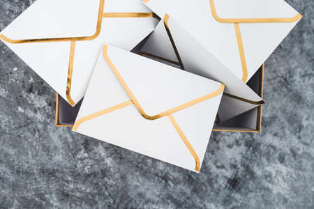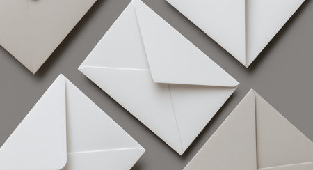 Envelopes in shades of white and light gray are artfully arranged against a neutral backdrop