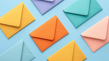 This image features a collection of colorful envelopes arranged beautifully on a blue background. Ideal for design projects, correspondence, or creative stationery ideas.