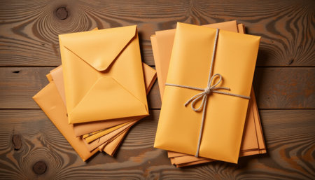 Rustic envelopes on wooden table, vintage mockup concept. generated by ai