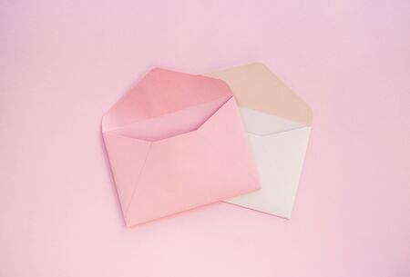 Two paper pink and white envelopes on pastel pink background.