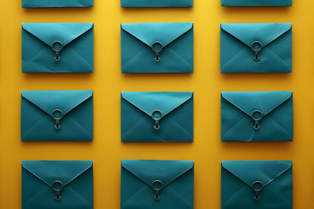 Geometric arrangement of closed teal envelopes on a vibrant yellow background, creating a striking and modern visual. perfect for use in design projects, greeting cards, posters, or any creative print materials. Generative AI