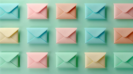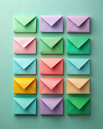 A series of colorful envelopes arranged in a grid pattern on a minimalistic green background, showing a clean and modern design.