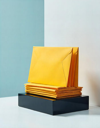 A stack of yellow envelopes neatly placed on a small black stand.