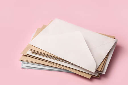 Stack of envelopes on working desk top view. Business mail