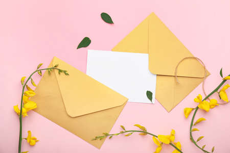 Composition with blank card and envelopes on color background