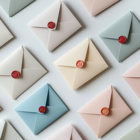 A row of envelopes with red wax seals and different colored envelopes. The envelopes are arranged in a pattern and are of various sizes