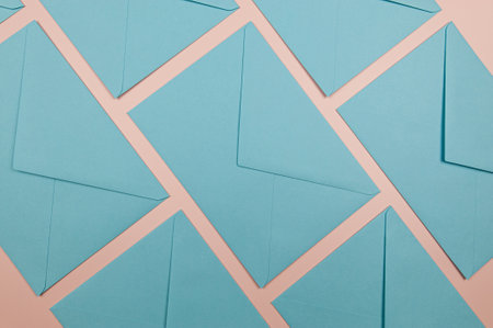 Top view of light blue envelopes on pink background. Post flat lay. Copy space.
