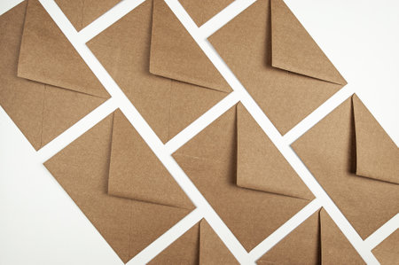 A collection of brown paper envelopes elegantly arranged on a light surface. Perfect for showcasing the beauty of simple stationery in creative projects or photography.
