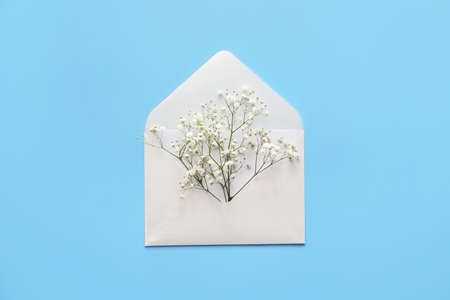 Beautiful gypsophila flowers and envelope on color background