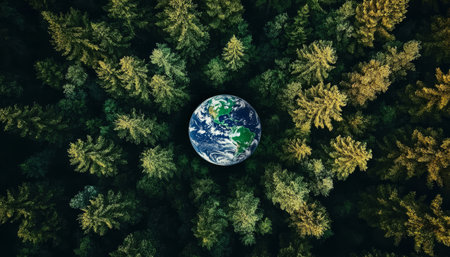 Overhead View of Globe Earth Nestled in Green Forest Canopy, Symbolizing Environmental Awareness
