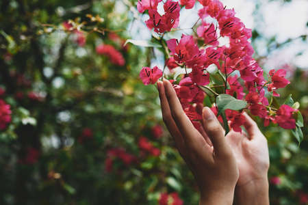Close-up of female hands touching flower tree