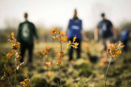 Shallow depth of field (selective focus) image with an oak sapling during an autumn tree planting.