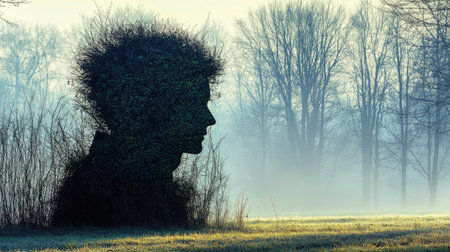 A stunning blend of human silhouette and nature creates an ethereal scene, featuring a hazy landscape with mist and trees, evoking calmness and contemplation.
