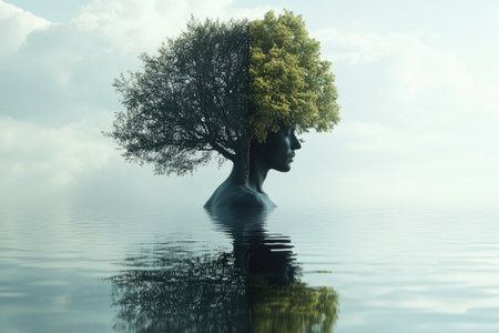 Surreal image of a woman merging with a tree emerging from calm water, representing the interconnectedness of humans and nature