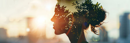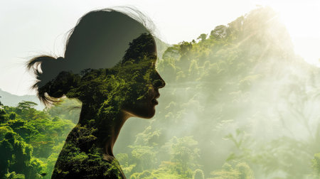 A stunning double exposure visual that merges a human silhouette with lush nature, illustrating the unity of mind and environment.