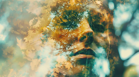 Double Exposure of Woman's Face with Ethereal Forest Elements. Blending Nature and Human Emotions