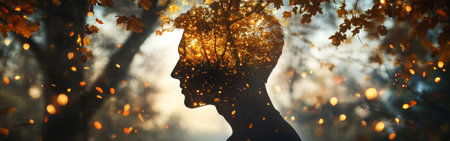 A man is depicted with a glowing outline, merging with colorful autumn trees. The tranquil outdoor atmosphere captures the essence of nature's beauty during fall.