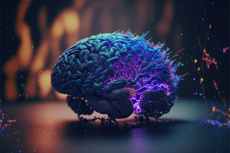 This artwork features a detailed brain against a colorful, abstract background depicting neural patterns.