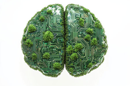 Intricate green brain design with circuit patterns and nature elements against a white background